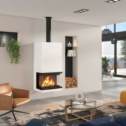 Laissez-vous séduire par sa VISION du feu! Son format 4/3 et ses 3 larges vitres vous invitent à contempler le spectacle des flammes depuis chaque côté de la pièce. Grâce à son étanchéité, ce foyer à bois est compatible avec les habitations neuves RE2020 et bénéficie de belles performances techniques et énergétiques pour vous offrir une combustion optimale. Côté pratique, il dispose d’un double système d’ouverture de porte (relevable et en tiroir) pour un grand confort d’utilisation au quotidien. Pour une installation sortant de l’ordinaire, optez pour une cheminée en version murale grâce au kit dédié.